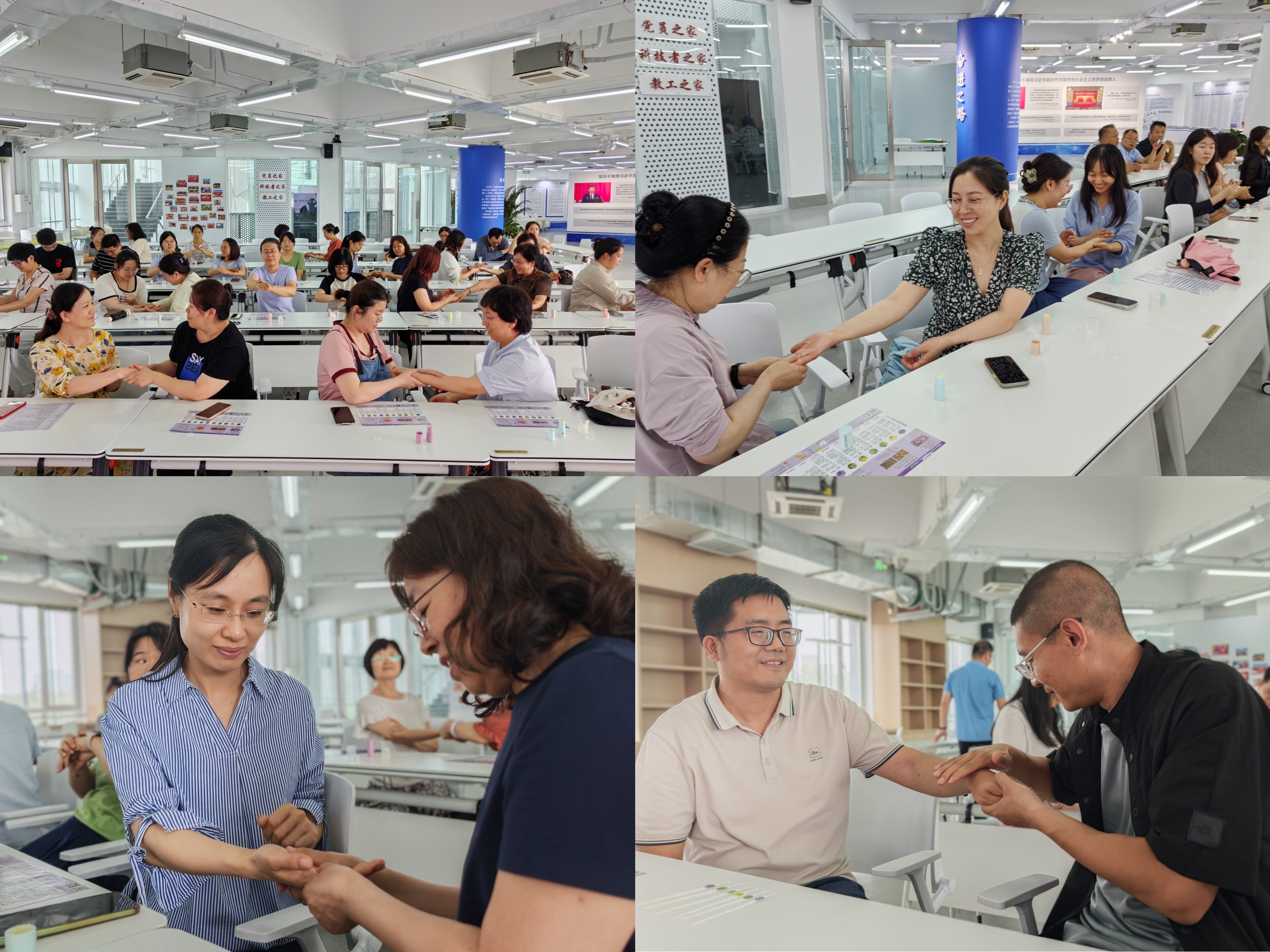 活動的尾聲是溫馨的“芳香手療·協作情深”環節。老師們兩人一組,在芳療師示范的簡單精油手部按摩手法下,互相為對方進行手部放松按摩。指尖流淌的不僅是精油的芬芳與溫度,更是同事間的關愛與情誼。現場歡聲笑語不斷,溫馨融洽的氛圍感染著每一個人。