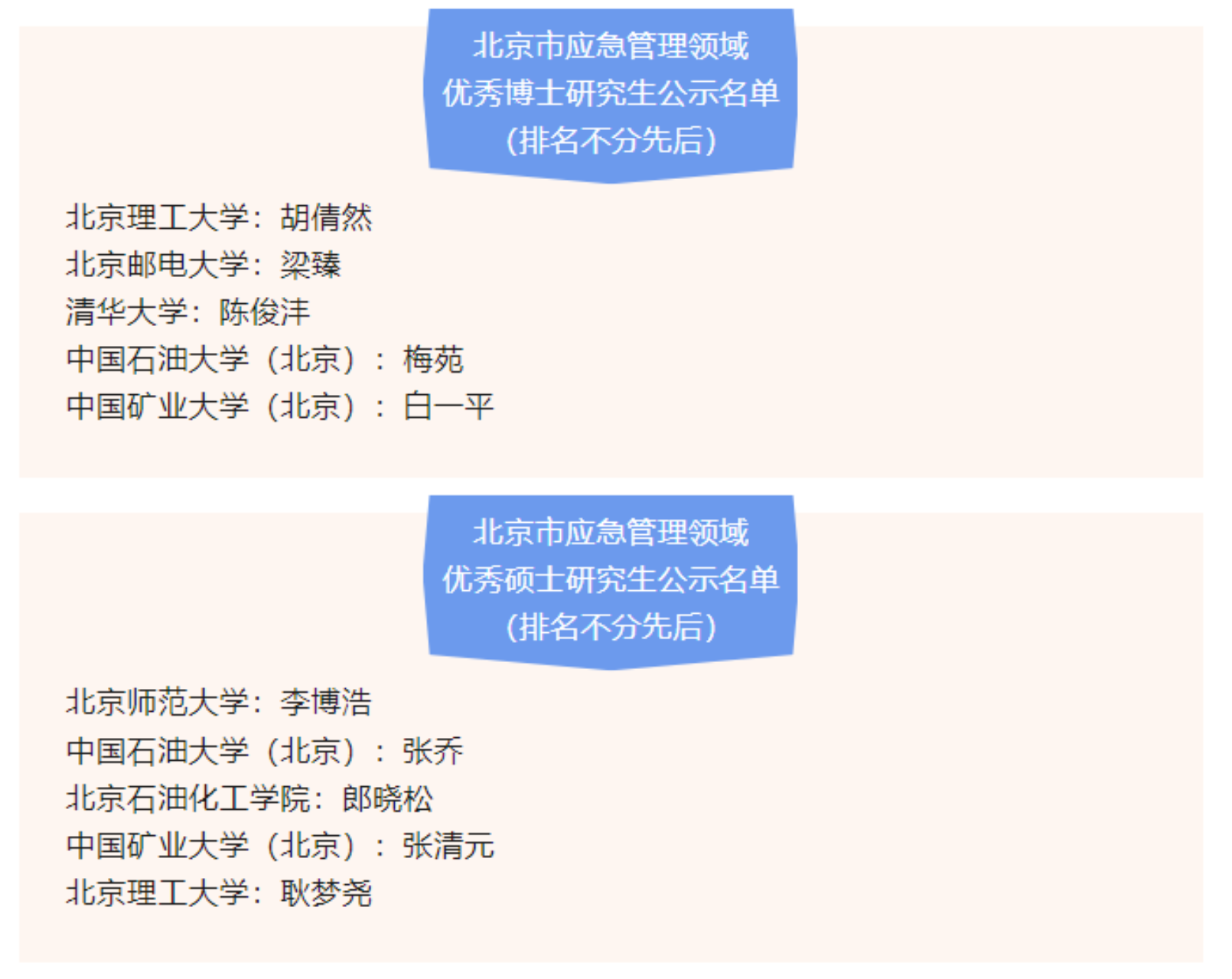“北京市應(yīng)急管理領(lǐng)域優(yōu)秀研究生”評(píng)定范圍為所有在京高校及科研院所培養(yǎng)的安全工程及應(yīng)急管理領(lǐng)域相關(guān)專(zhuān)業(yè)的在讀研究生,每年評(píng)選碩士生5人、博士生5人。