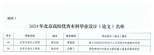 近日,北京市教育委員會發布《北京市教育委員會關于公布2024年高等學校優秀畢業設計(論文)名單的通知》(京教函[2024]589號),我校曹建樹老師指導的《基于NAND閃存芯片工藝改進與性能提升研究》、呂鵬飛老師指導的《惰性粉體對木粉塵云最低著火溫度的影響研究》兩篇畢業設計(論文)名列其中,曹建樹、呂鵬飛老師獲評優秀指導教師。