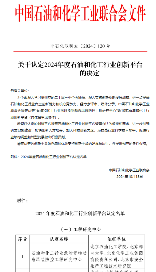 2024年10月18日,中國石油和化學工業聯合會公布2024年度石油和化工行業創新平臺名單,由我校牽頭,北京郵電大學、北京化學工業集團有限責任公司、北京市安全生產工程技術研究院聯合申報的“石油和化工行業危險貨物動態風險防控工程研究中心”成功獲批。