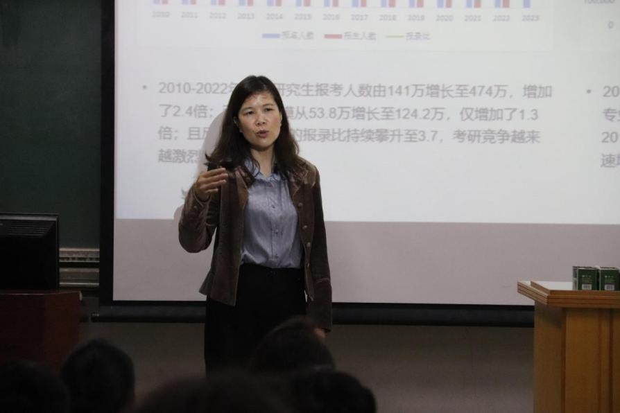張志蓮副處長從學(xué)科優(yōu)勢與特色、培養(yǎng)條件與保障、研究生獎助體系、考研趨勢分析等方面介紹了考研政策,分析了研招形勢,展示了近年來研究生報考及錄取情況,引導(dǎo)同學(xué)們將升學(xué)深造作為提升自身價值的優(yōu)先選擇。張?zhí)庨L還重點(diǎn)介紹了我校學(xué)科專業(yè)特點(diǎn)、科研實(shí)力、特色優(yōu)勢、歷年招生情況等,鼓勵同學(xué)們積極報考我校研究生。