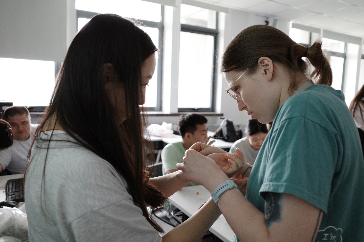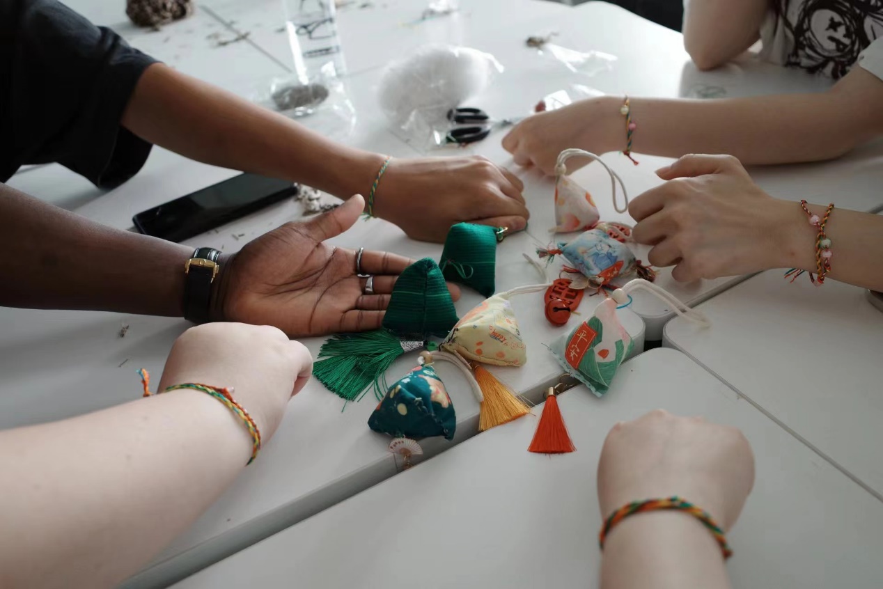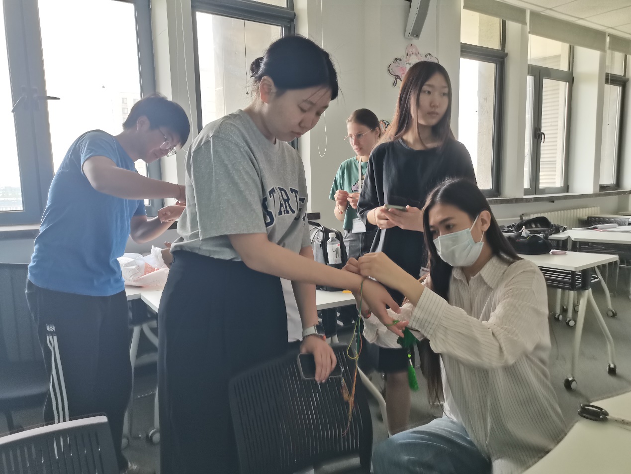 系五彩繩是端午節必不可少的習俗之一,編織五彩繩更是展現出了合作與團結的力量。每個人都在盡情地展示自己的創意和技藝,共同完成了一件件美麗的作品。互幫互助完成佩戴,此時的五彩線不僅是端午節的習俗,更是拉進了中外的友誼之線。