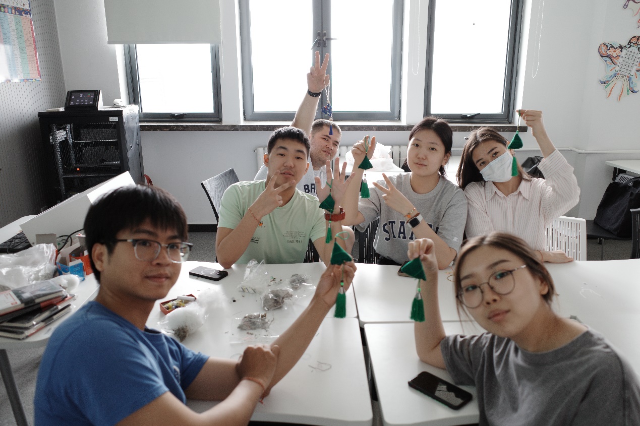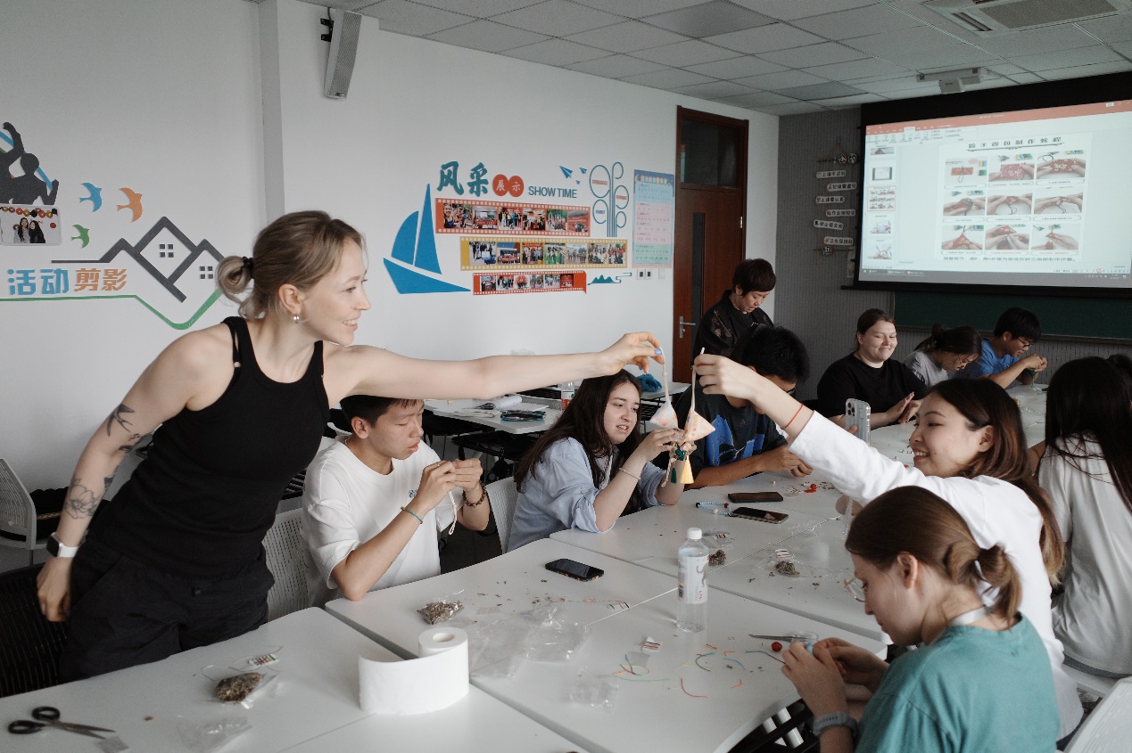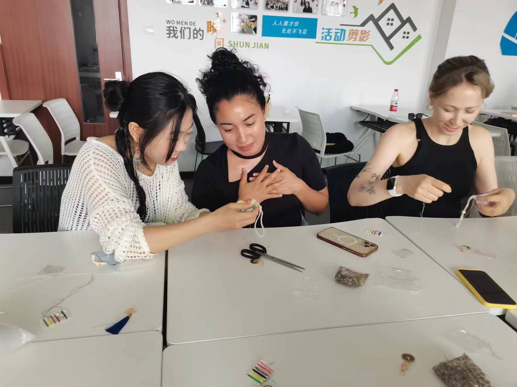 系五彩繩是端午節必不可少的習俗之一,編織五彩繩更是展現出了合作與團結的力量。每個人都在盡情地展示自己的創意和技藝,共同完成了一件件美麗的作品。互幫互助完成佩戴,此時的五彩線不僅是端午節的習俗,更是拉進了中外的友誼之線。