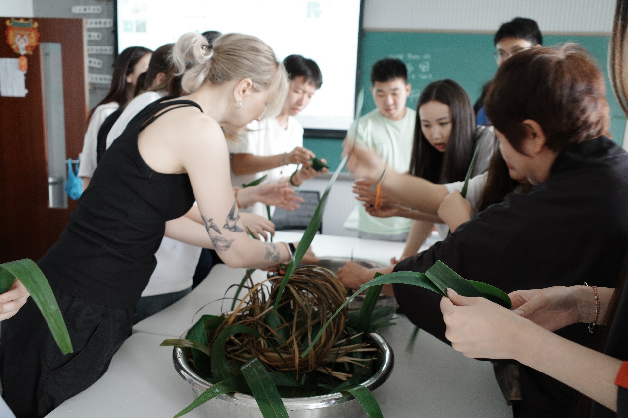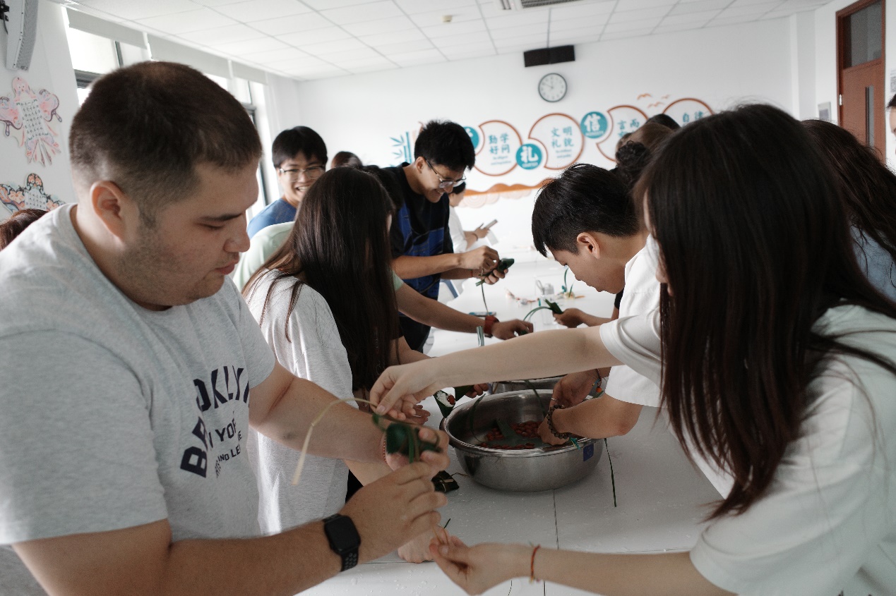 學院為留學生們準備了端午傳統食物——粽子,為了更真切的感受這種美食文化,宿舍的老師們將制作材料搬到教室,讓同學們親身體驗制作過程。