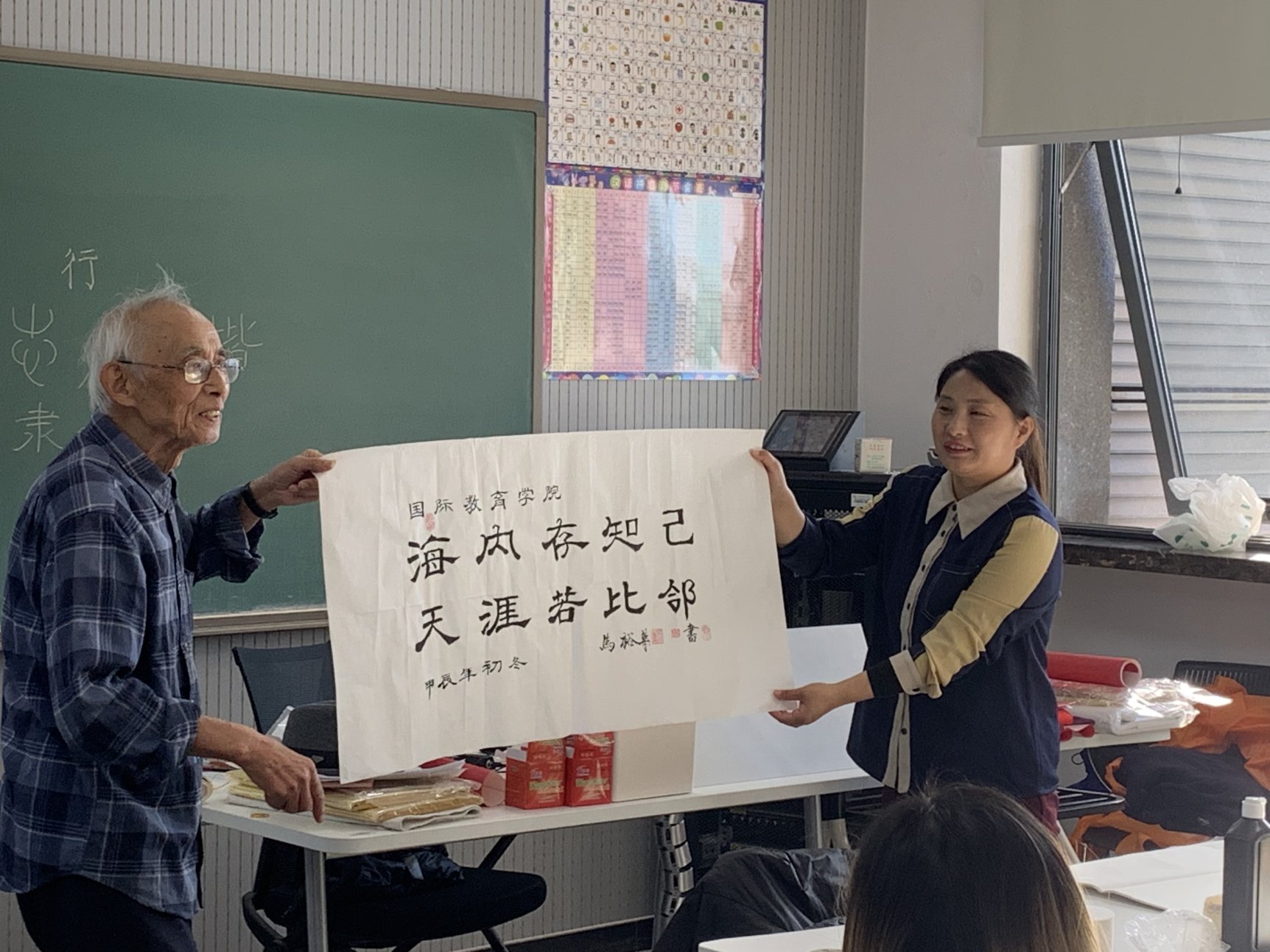 此次活動,邀請到了我校的知名人士馬裕華老師為主講教師,課前馬老師做了充足的準備,帶了很多相關材料,精心為留學生們準備了一幅書法作品作為禮物贈送給大家。
