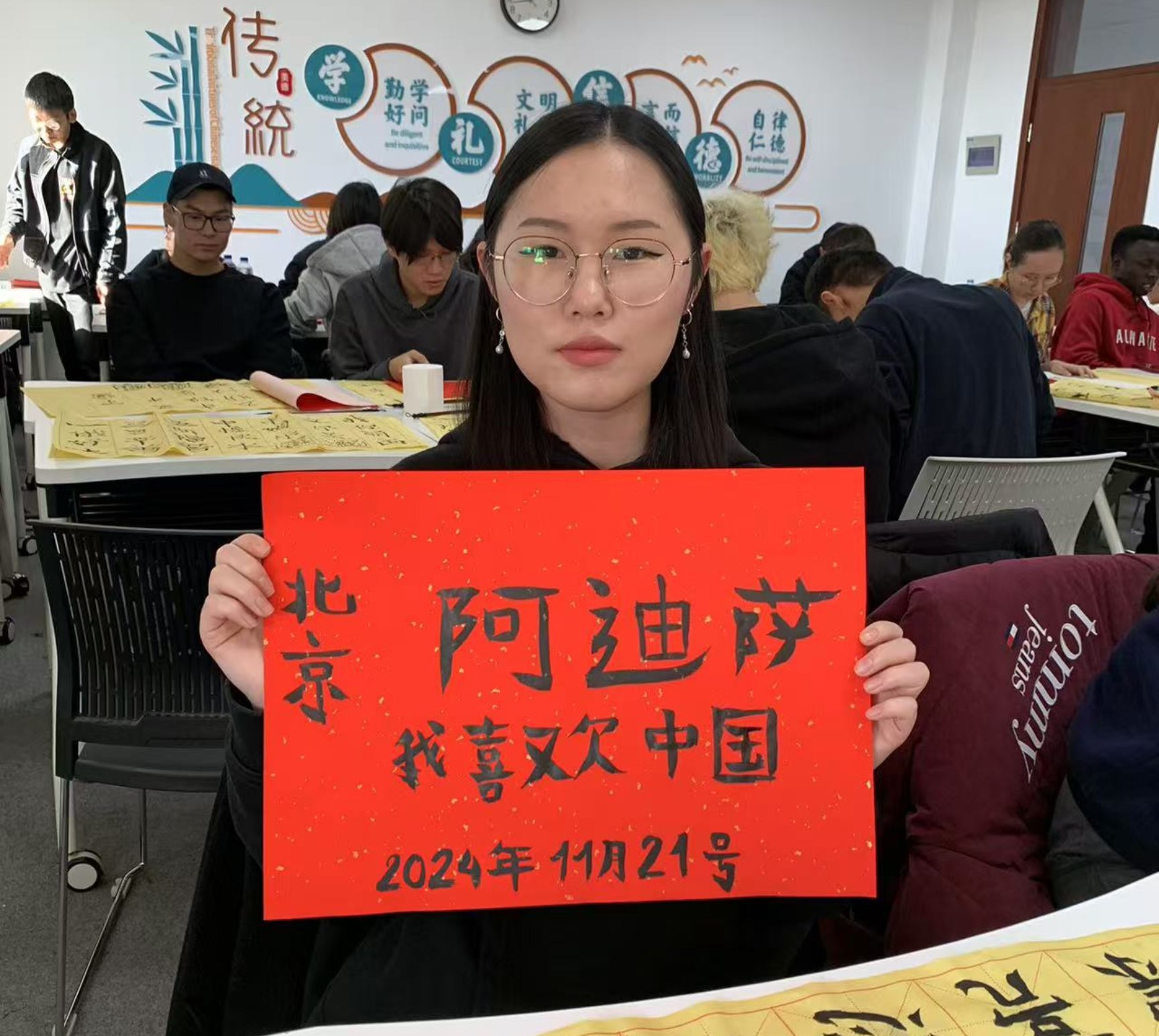 后記:課后學生們紛紛表示這次書法體驗活動太有意思了,寫得還不盡興。放學的時候,阿迪薩對老師說:“老師,我愛你,我愛中國。”我不敢相信自己的耳朵,又問了一遍,你說什么?“老師,我愛你,我愛中國”。我想,這是留學生最深情也是最真實的告白,既是對老師們的認可,也是書法文化課堂的意義。漢語多樣化的課堂,讓學生們深刻地體驗了中國語言之美。在此,特別感謝我們國際教育學院領導和同事,為我們請來這么優秀的書法教師,為我們提供人力、財力的支持,感謝你們讓我們的漢語教學更上一層樓。