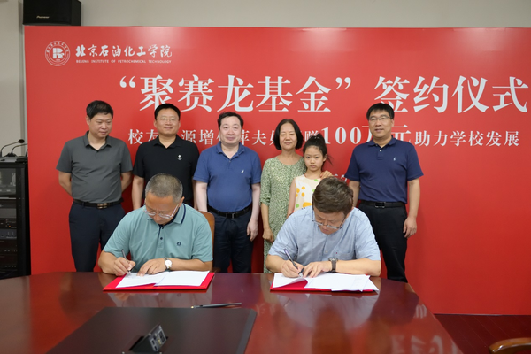 7月28日,聚賽龍基金捐贈百萬簽約儀式在我校舉行。我校化78校友、廣州市聚賽龍工程塑料有限公司董事長郝源增及夫人任萍,我校黨委常委、副院長靳海波出席捐贈儀式。儀式由教育基金會理事長、校友辦主任何曉紅主持。