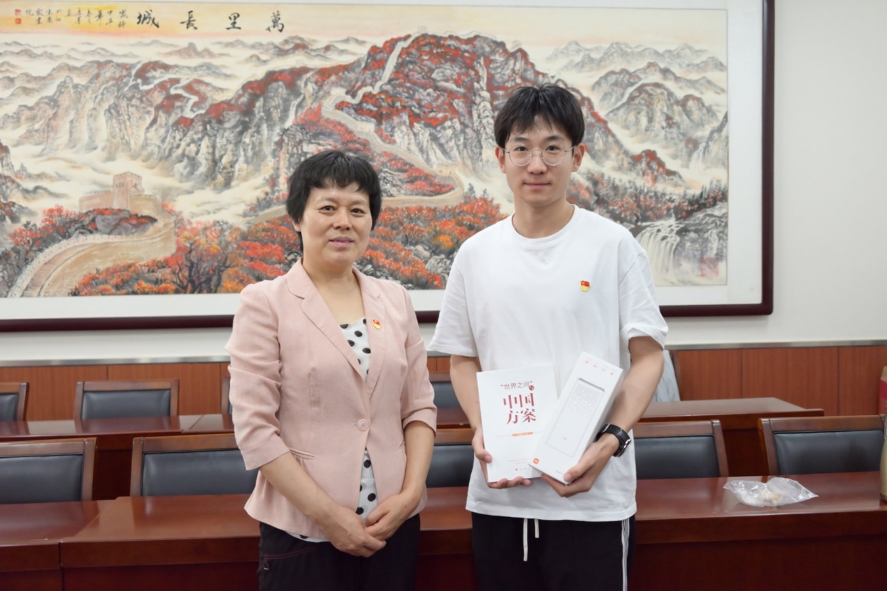 劉穎祝福大家在新的學習、工作崗位上“不負韶華,不負時代,不負人民,在青春的賽道上奮力奔跑,爭取跑出當代青年的最好成績”“爭做堪當民族復興重任的時代新人”。話短情長,帶著離別的不舍與牽掛,劉穎向畢業生代表贈送了書籍和紀念品。