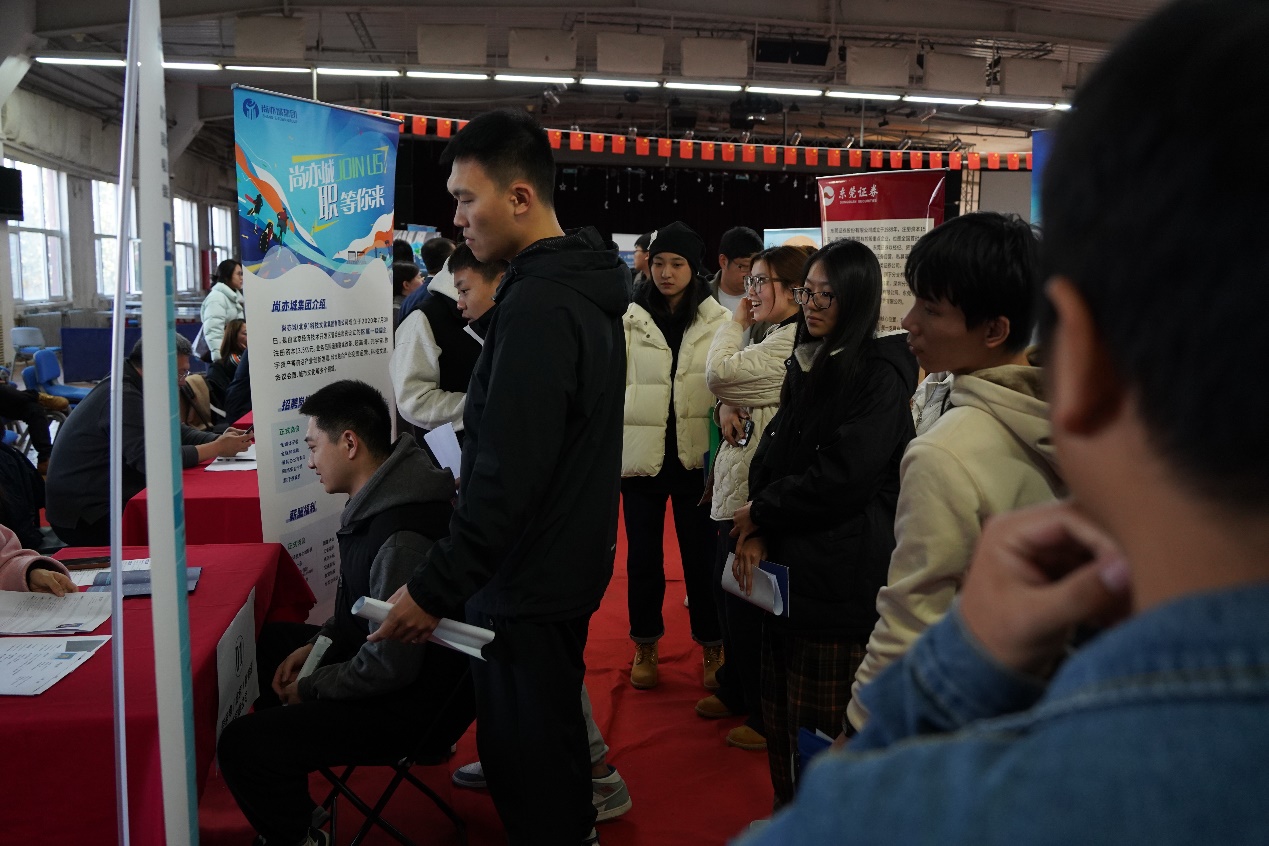 畢業(yè)生手持簡歷穿梭在招聘展位前,尋找心儀崗位,招聘人士與學(xué)生熱情交流。