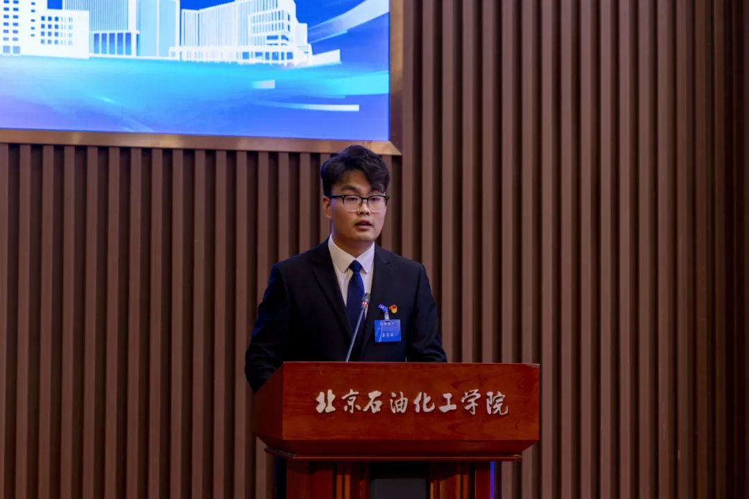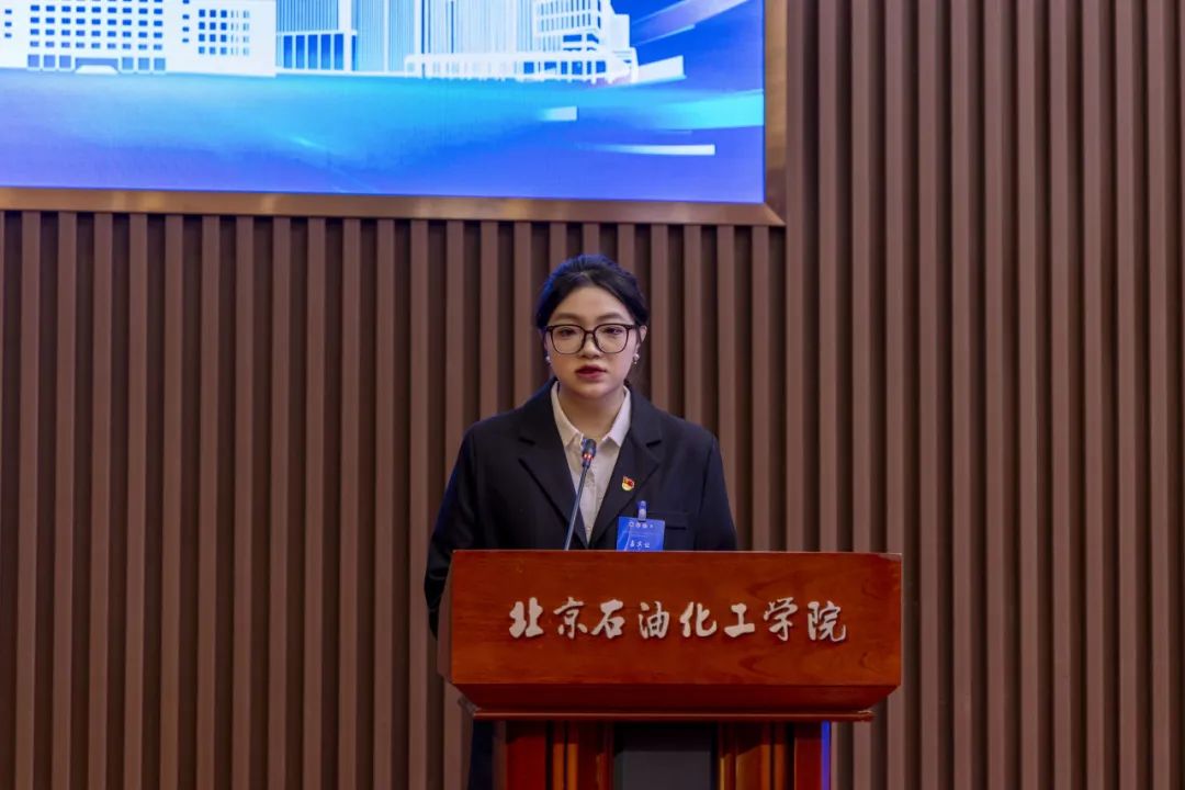 張秀茹同學代表北京石油化工學院第三十屆學生會、薛智龍同學代表北京石油化工學院第四屆研究生會作工作報告。