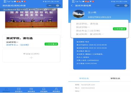 復(fù)試通知請關(guān)注學(xué)校、學(xué)院的網(wǎng)上通知,對通過審核并已安排復(fù)試的考生可在微信“研招復(fù)試”小程序中查看復(fù)試時間安排,如下圖所示: