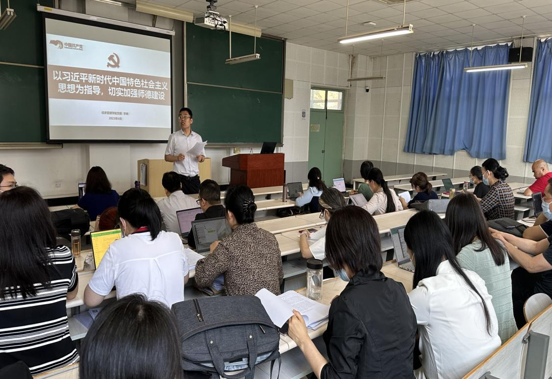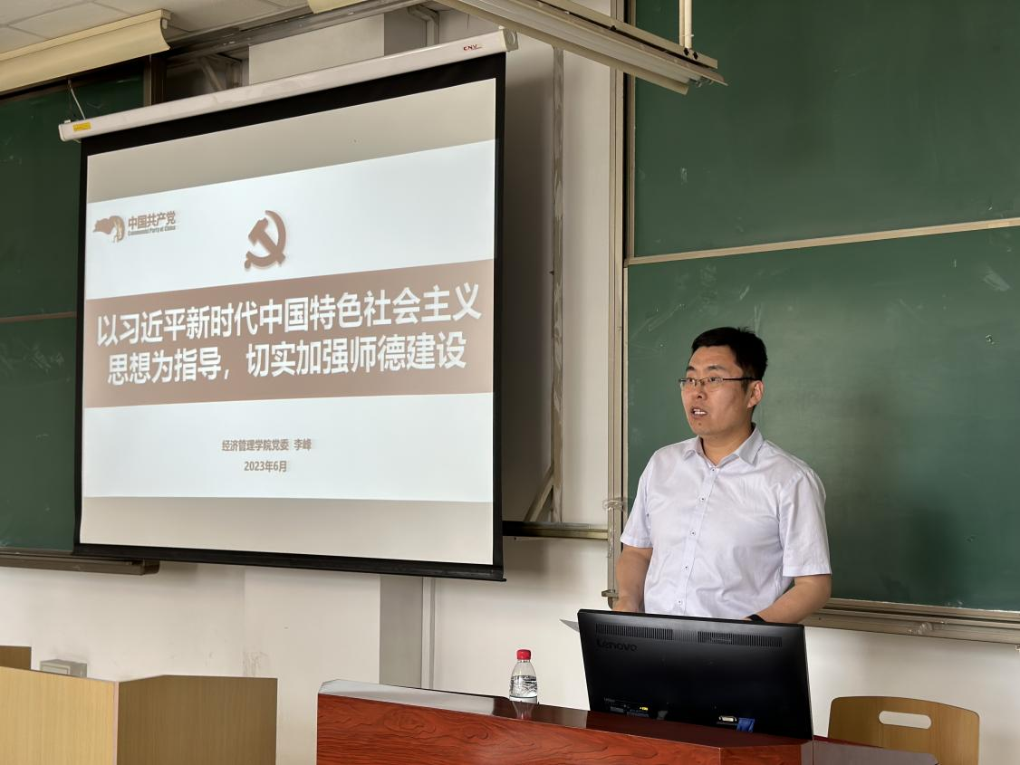6月6日下午,經濟管理學院黨委書記李峰以《以習近平新時代中國特色社會主義思想為指導,切實加強師德建設》為題為全體教工黨員講授主題教育專題黨課。