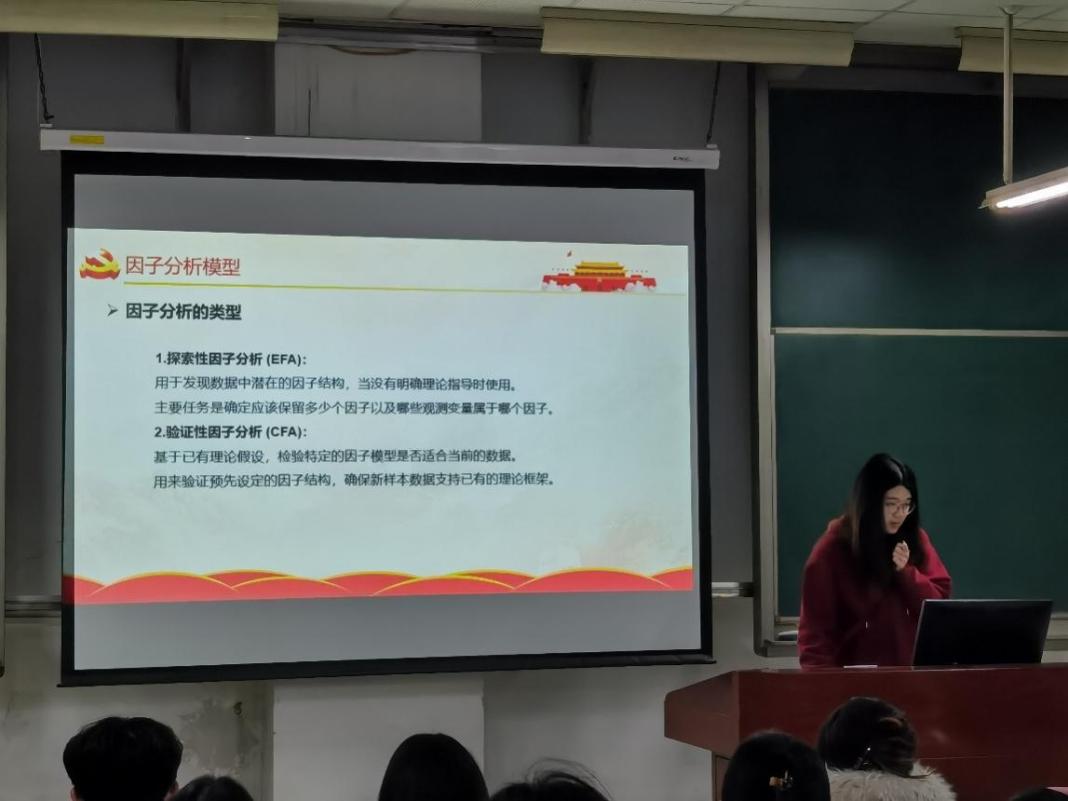 張子文同學重點介紹了因子分析的兩種類型:探索性因子分析(EFA)和驗證性因子分析(CFA)。她闡述了EFA用于發現潛在因子結構,而CFA則基于理論假設驗證因子模型。此外,她還分享了使用SPSS和Python進行因子分析的具體步驟和結果解讀方法。