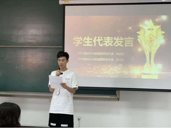 接下來,2019級ACCA實驗班學生代表倪珀然同學上臺發言,表示要盡快適應大學生活,樹立奮斗目標,與同學們共同營造團結有愛、積極向上的氛圍,秉持尊師肯學、持之以恒的精神,一如既往地勤學善問、積極上進、學有所成。