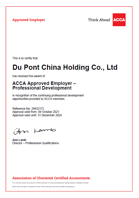 近日,杜邦中國集團有限公司獲得ACCA (特許公認會計師公會) 專業發展類認可雇主資格。