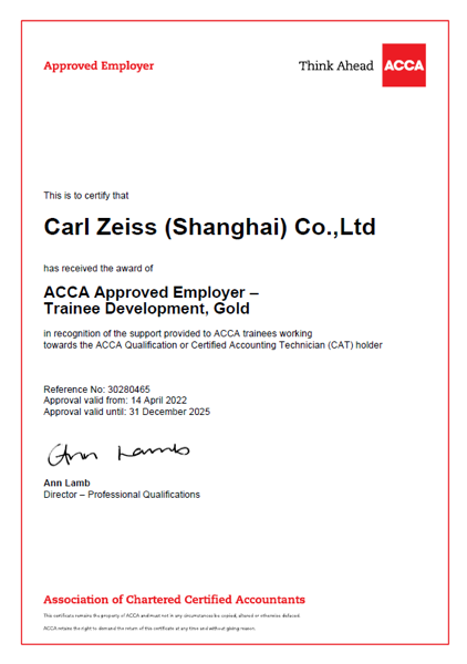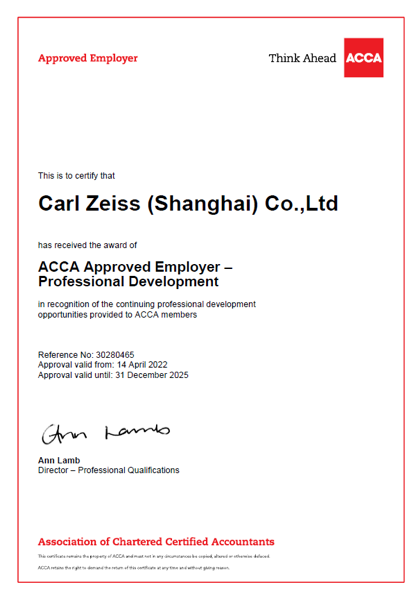 近日,卡爾蔡司(上海)管理有限公司獲得ACCA (特許公認會計師公會) 專業發展類認可雇主以及培訓生發展類黃金級認可雇主資格。