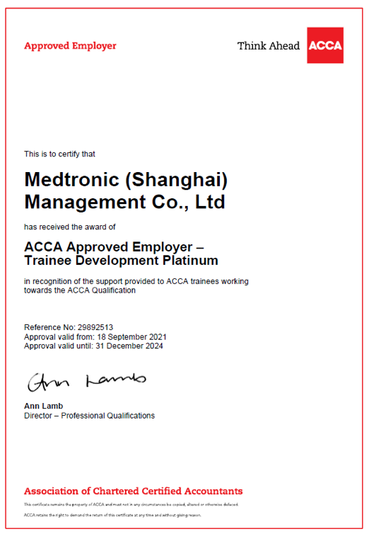 近日,美敦力(上海)管理有限公司獲得ACCA(特許公認會計師公會)培訓生發展類白金級認可雇主資格。