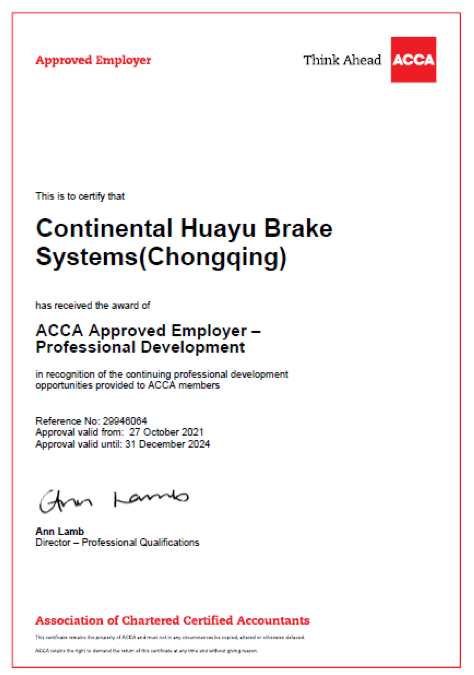 作為ACCA專業發展類認可雇主,華域大陸汽車制動系統(重慶)有限公司內ACCA會員均可通過雇主途徑申報繼續教育學時(CPD),無需記錄課時和憑證。