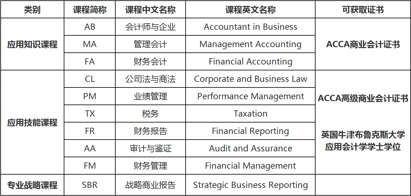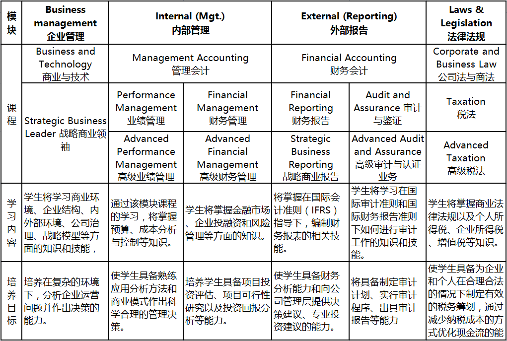 ACCA課程主要分為三個階段:應用知識階段、應用技能階段、專業戰略階段,共計15門課程,順利通過13門即可,內容涵蓋會計、財務、管理學、經濟學、投資、稅務、審計、人力資源等。