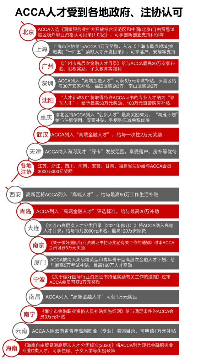 在各地方政府指定的高端人才引進政策中,ACCA會員均被列入人才引進目錄。在住房、醫療、子女教育等方面均享受優厚待遇。