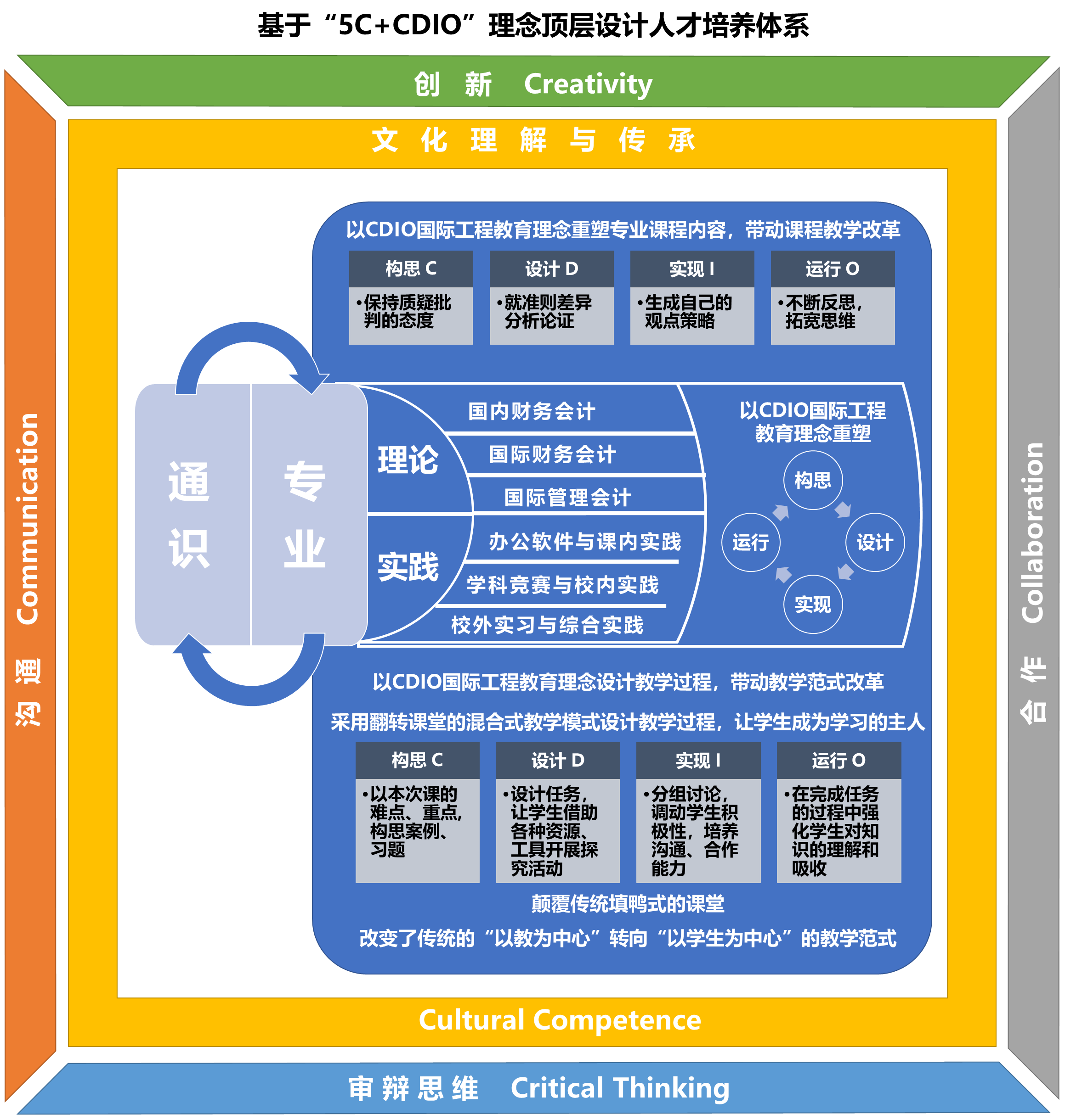 ACCA實驗班形成了以國際人才核心素養(yǎng)5C①模型設(shè)計國際人才培養(yǎng)方案和實踐課程體系,以CDIO②國際工程教育模式設(shè)計課程內(nèi)容、教學(xué)過程,帶動課程教學(xué)改革和教學(xué)范式改革,突破了以往國際化人才文化環(huán)境單一、視野單一的局限性,創(chuàng)設(shè)多元文化、思想、方法、實踐等相互碰撞的問題情境和國際會計審計實務(wù)場景,凸顯跨文化理解、認(rèn)同和踐行的國際化人才培養(yǎng)特色。