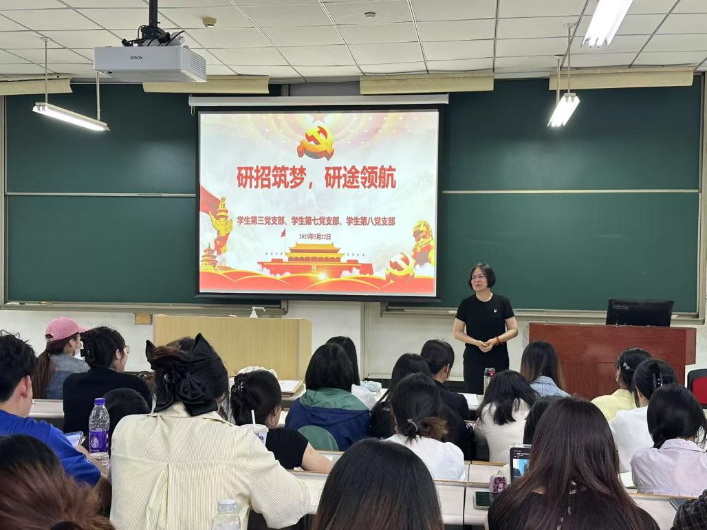 為幫助本科生深入了解研究生招生政策、拓寬學(xué)術(shù)視野,激發(fā)其深造熱情,北京石油化工學(xué)院經(jīng)濟(jì)管理學(xué)院學(xué)生第三、第七、第八黨支部于5月22日在康莊校區(qū)103教室聯(lián)合舉辦了“研招筑夢,研途領(lǐng)航”的主題黨日活動。全體研究生黨員、部分入黨積極分子和第三支部的學(xué)生黨員及學(xué)院有考研意向的學(xué)生共計(jì)近100人參加了此次座談。