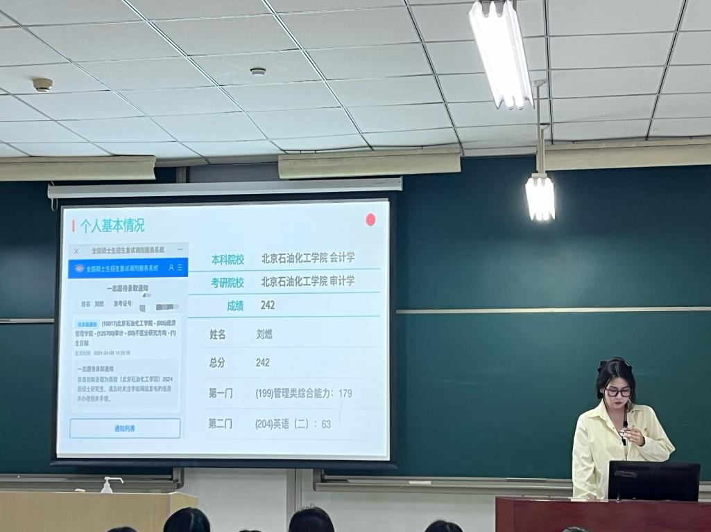 金禹霖同學(xué)在分享自己經(jīng)驗(yàn)的同時(shí),特別強(qiáng)調(diào)了備考各階段需要做的工作,她還從研究技能的培養(yǎng)、參與競賽、黨團(tuán)活動等方面分享了自己研究生階段的學(xué)習(xí)生活,激勵(lì)學(xué)弟學(xué)妹報(bào)考。