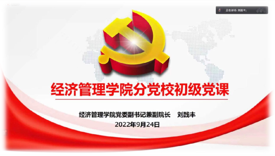 為了讓同學們盡快適應大學生活,明確奮斗的目標,幫助具有入黨意愿的學生們學習入黨流程,樹立正確的入黨動機,了解學習黨支部情況。2022924日,經濟管理學院舉辦2022級新生初級黨課,本次黨課由經濟管理學院黨委副書記劉踐豐老師主講。