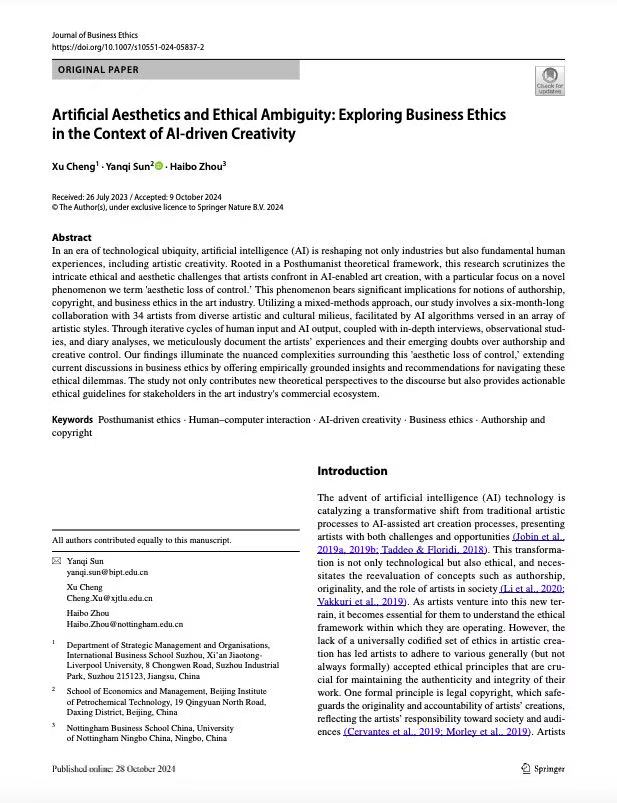2024年10月28日,經(jīng)濟管理教師孫彥琦副教授以通訊作者在FT50國際商科權威期刊《Journal of Business Ethics》發(fā)表研究成果“Artificial Aesthetics and Ethical Ambiguity: Exploring Business Ethics in the Context of AI?driven Creativity”(人工美學與倫理模糊性:探索人工智能驅動創(chuàng)意中的商業(yè)倫理)。該研究成果受北京石油化工學院孫彥琦副教授主持的北京市哲學社會科學規(guī)劃項目(23JJC035)的資助支持,與西交利物浦大學Xu Cheng助理教授、寧波諾丁漢大學的Haibo Zhou副教授合作完成。