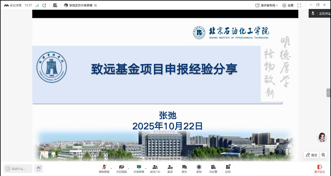 為助力新入職青年教師快速適應(yīng)科研工作節(jié)奏,扎實(shí)推進(jìn)有組織科研開展,10 月 22 日,經(jīng)濟(jì)管理學(xué)院舉辦 2026 年度學(xué)校致遠(yuǎn)科研基金項(xiàng)目申報(bào)線上交流會。本次會議邀請 2025年獲批該基金項(xiàng)目的張馳、朱夢影兩位青年教師分享申報(bào)經(jīng)驗(yàn),李海萍院長主持會議,全體項(xiàng)目申報(bào)人及2025年新入職教師參會。