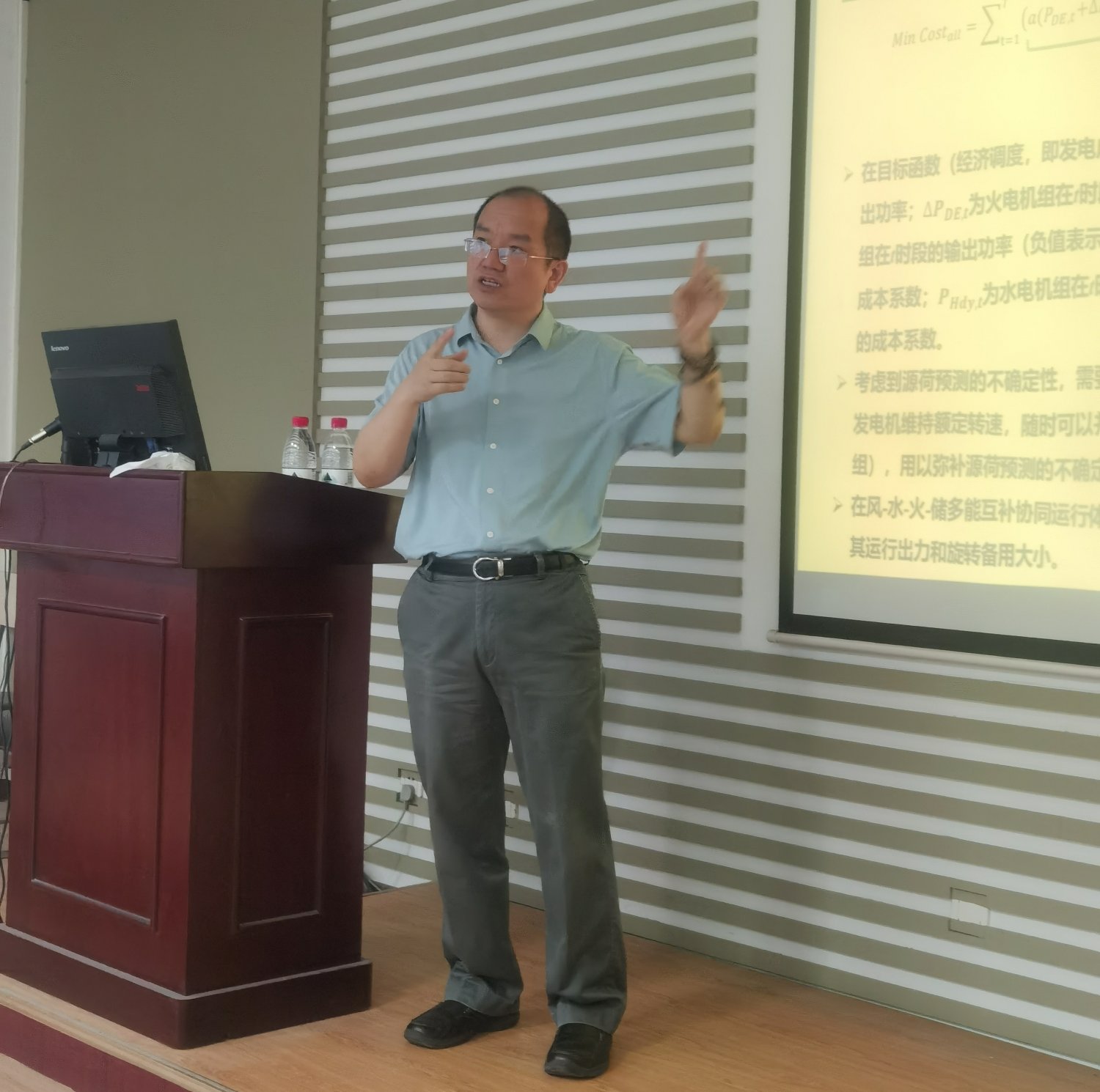 余樂安教授向大家分享能源電力系統多能互補協同調度優化問題的學術成果。報告首先針對電源-負荷預測誤差的數據分布特征,選擇適用的不確定性分析方法,對源荷預測的不確定性特征進行量化分析,并生成區間預測結果。其次,考慮到電源側中風電出力預測與負荷側需求預測的不確定性,設計多能互補協同調度決策優化方案,解決源荷不確定條件下的日內滾動調度問題。再次,基于源荷預測的不確定性分析結果,以發電成本最小化為目標,構建能源電力系統多能互補協同調度優化模型,并選擇優化算法進行求解。最后,對多能互補協同調度優化方案的創新點進行總結,并指出不足之處與未來研究方向。