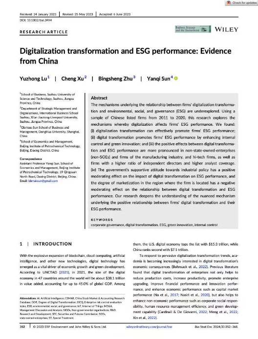 經濟管理學院孫彥琦副教授2024年2月以通訊作者發表在《Business Strategy and the Environment》期刊的論文“Digitalization transformation and ESG performance: Evidence from China”(數字化轉型與ESG績效:來自中國的證據)入選ESI 全球TOP 0.1%熱點論文,同時入選ESI全球TOP 1%高被引論文。該研究成果由北京石油化工學院孫彥琦副教授、蘇州科技大學陸羽中老師、西交利物浦大學的Cheng Xu助理教授和東華大學朱炳昇博士合作完成。《Business Strategy and the Environment》是中科院一區TOP期刊(管理學),近五年影響因子達12.5,同時被列為ABS-3期刊。
