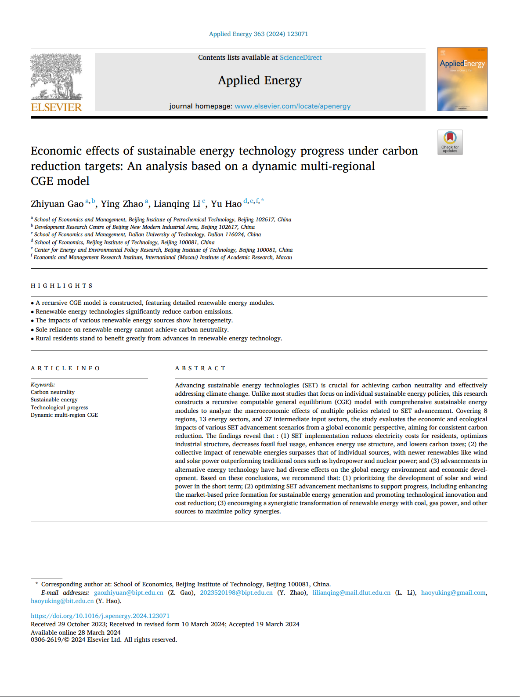 經濟管理學院高志遠副教授2024年6月以第一作者發表在《Applied Energy》期刊上的論文“Economic effects of sustainable energy technology progress under carbon reduction targets: An analysis based on a dynamic multi-regional CGE model”(碳減排目標下可持續能源技術進步的經濟效應:基于動態多區域可計算CGE模型的分析)入選工程技術領域ESI全球TOP 1%高被引論文。該研究成果由北京石油化工學院高志遠副教授、大連理工大學李蓮青博士和北京理工大學郝宇教授合作完成。《Applied Energy》是能源領域具有廣泛影響力的國際期刊,屬于中科院一區TOP期刊、JCR一區期刊,影響因子10.1。