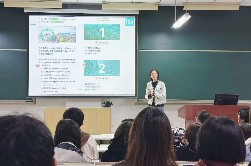 德國FOM大學趙佳杰老師圍繞德國留學與生活,報告了德國高質量教育體系、文化體驗、實踐機會,免學費的高性價比優勢,并分享了德國FOM大學的留學生活,為有意留學德國的同學提供全面指導和建議。