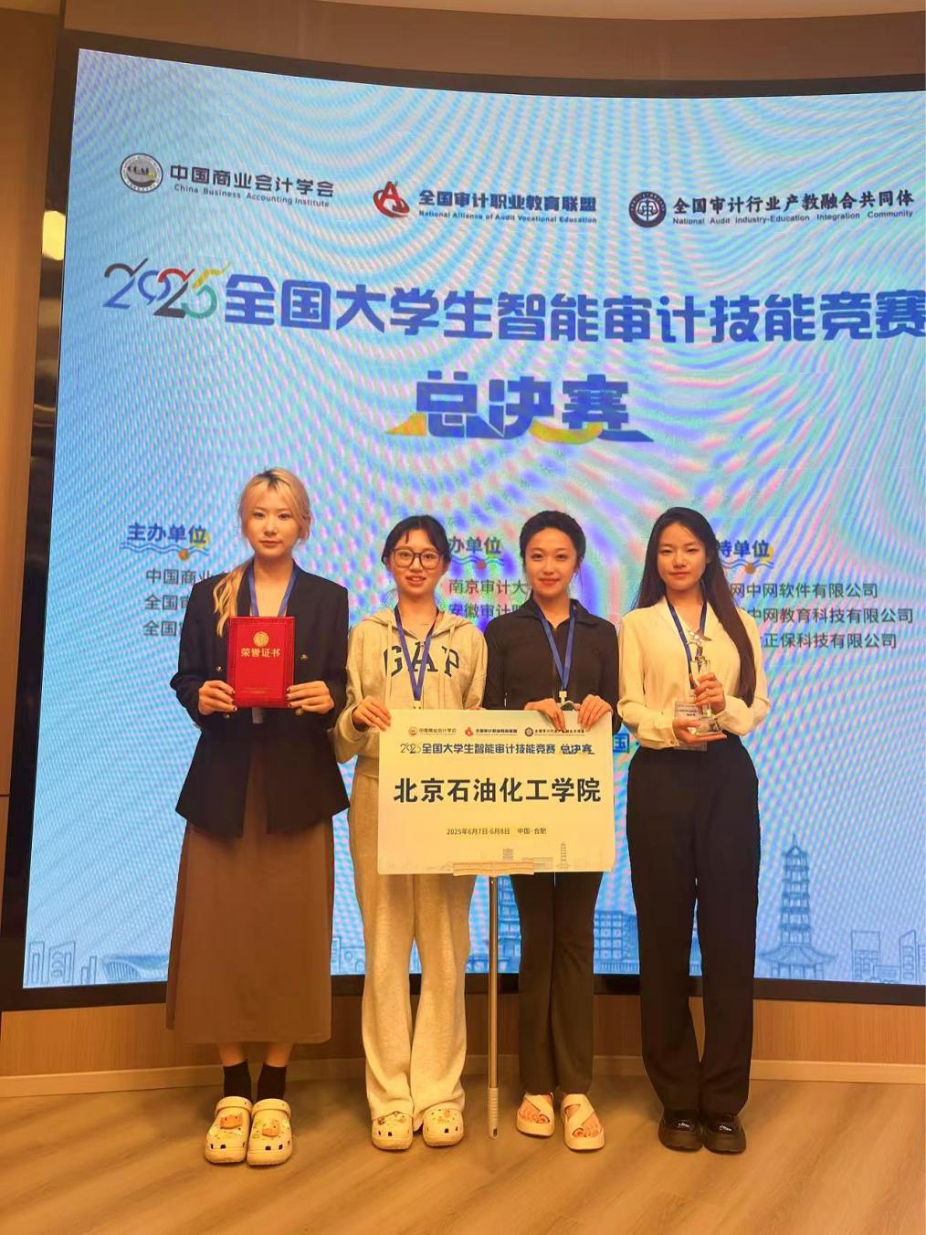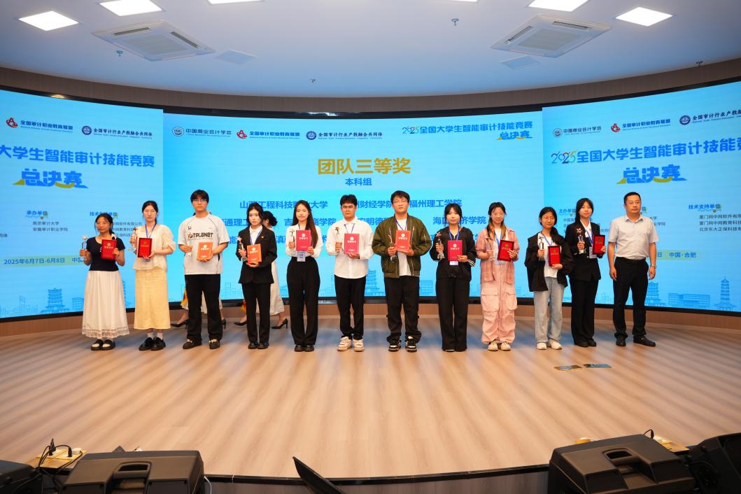 2025年6月8日,全國大學生智能審計技能競賽全國總決賽在安徽審計職業學院圓滿落幕。由我校曹圓圓老師指導,白靜宜、張靈溪、辛同悅、張晨陽四位同學組成的參賽團隊,憑借扎實的專業功底和出色的數智審計技術應用能力,在激烈競爭中脫穎而出,最終榮獲全國總決賽三等獎。