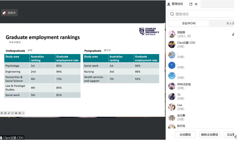 澳大利亞查爾斯達爾文大學大中華區負責人沈慧老師圍繞澳大利亞查爾斯達爾文大學留學生活與就業情況,報告了查爾斯達爾文大學的研究生教育模式、文化體驗、就業優勢,為同學提供參考。