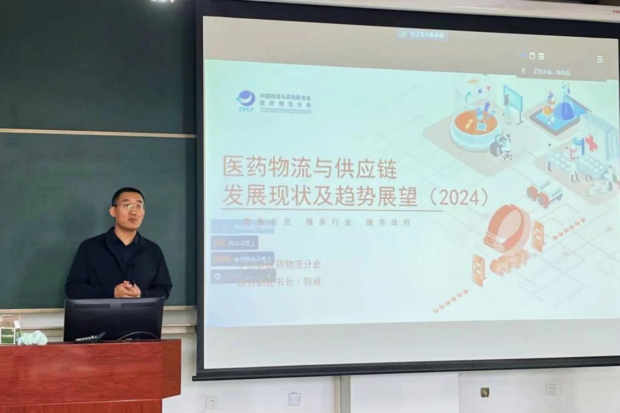 2024年9月27日,中國物流與采購聯合會(以下簡稱“中物聯”)醫藥物流分會郭威常務副秘書長受邀為物流管理、營銷和電商專業大三以及大四學生做了主題為《醫藥物流與供應鏈發展現狀及趨勢展望》的報告。郭威現為中國物流與采購聯合會醫藥物流分會常務副秘書長、全國物流標準化技術委員會醫藥物流分技術委員會副秘書長,曾負責《藥品冷鏈物流運作規范》《藥品物流服務規范》《醫藥產品冷鏈物流溫控設施設備驗證性能確認技術規范》等多項醫藥的國家和行業標準制修訂工作,承擔了《第三方醫藥物流發展現狀與趨勢》《醫藥物流智慧化現狀及發展趨勢》《中國醫藥物流發展報告》等多項研究工作,支撐行業相關政策的制定出臺,為交通部、工信部、發改委等部委提供關于疫苗冷鏈運力等的調研報告。