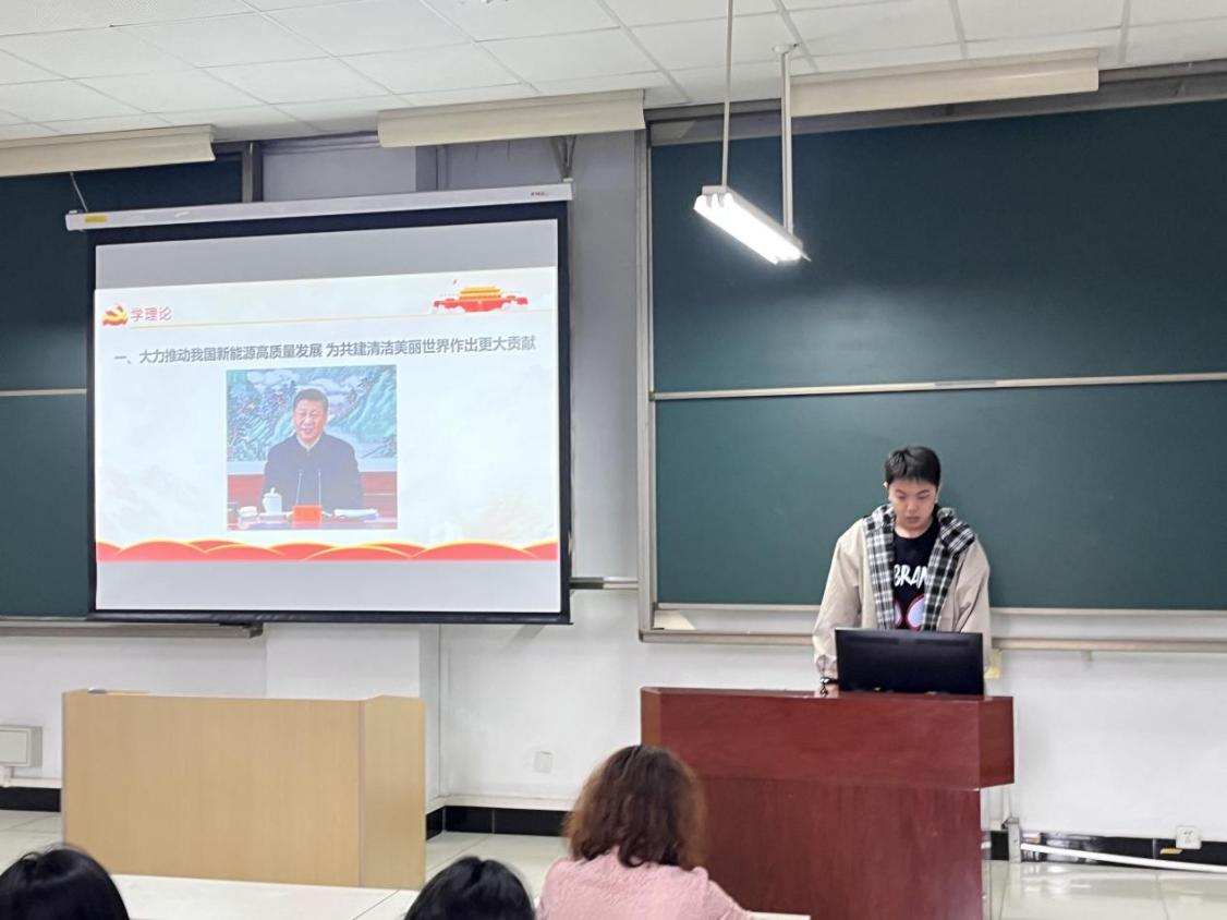 白軼哲同學首先根據中共中央政治局2024年2月29日就新能源技術與我國的能源安全進行第十二次集體學習的內容,即能源安全事關經濟社會發(fā)展全局,積極發(fā)展清潔能源,推動經濟社會綠色低碳轉型。強調要順勢而為、乘勢而上,以更大力度推動我國新能源高質量發(fā)展,為中國式現代化建設提供安全可靠的能源保障,為共建清潔美麗的世界作出更大貢獻。白軼哲同學接著領學了中央黨校(國家行政學院)中青年干部培訓班的有關內容,強調青年人要自覺做黨的創(chuàng)新理論的篤信篤行者,堅持不懈用新時代中國特色社會主義思想凝心鑄魂,不斷筑牢信仰之基、補足精神之鈣、把穩(wěn)思想之舵,切實提升馬克思主義理論水平和運用能力,自覺做對黨忠誠老實的模范踐行者。白軼哲同學還就相關內容開展了互動環(huán)節(jié)。相信通過互動環(huán)節(jié),同學們可以更加領會相關的精神。