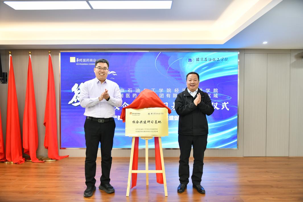華潤醫(yī)商北京區(qū)域總經(jīng)理陳威和經(jīng)濟管理學(xué)院黨委書記李峰共同為校企共建研習(xí)基地揭牌。