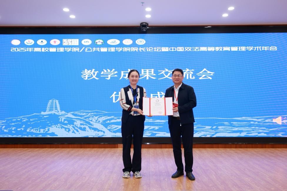 在“優秀教學成果交流會”上,姚迪老師就《應用為本 數智驅動 綠安賦能:工科高校經管人才培養模式創新與實踐》這一教學成果進行了匯報,內容包括教學問題及成果簡介、成果解決教學問題的方法、成果的創新點以及成果的推廣應用效果。成果得到與會高校的廣泛認可,榮獲優秀教學成果一等獎。