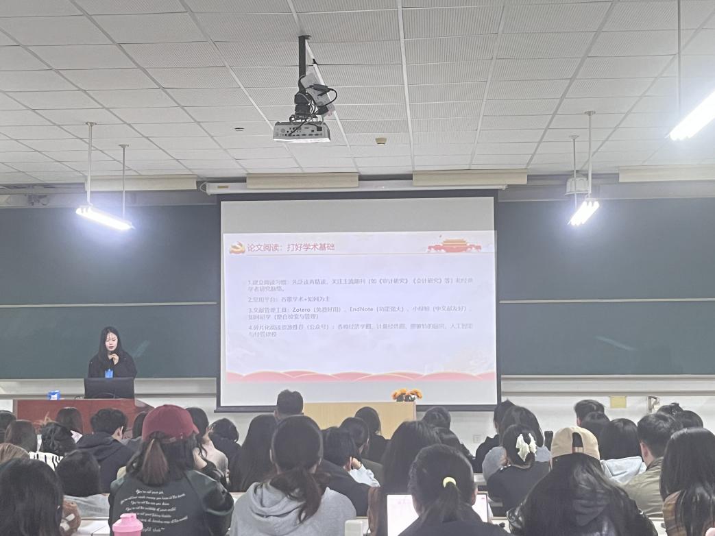 論壇第二部分“練本領(lǐng)”由審研24級黃祥鑫同學(xué)主講,她以“論文寫作與組會匯報”為題,從文獻(xiàn)閱讀、組會匯報、實(shí)證操作等方面展開分享。黃祥鑫同學(xué)建議大家建立良好的閱讀習(xí)慣,在組會匯報中要注重邏輯清晰、表達(dá)自信,善于從師兄師姐的分享中汲取經(jīng)驗,在實(shí)證研究中循序漸進(jìn)掌握SPSS、Stata、Python等工具,通過復(fù)現(xiàn)經(jīng)典論文提升實(shí)操能力。