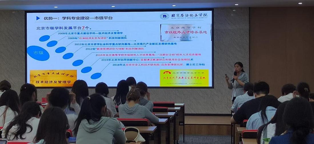 在鄭州財經學院,雙方首先開展了戰略合作洽談會,鄭州財經學院副校長許玲玲主持會議,雙方就研究生招生等事宜進行了深入交流。之后,李海萍副院長在會計學院會議室,面向會計學院60余名本科生開展了2026年研究生招生專場宣講,她從發展歷程、師資隊伍、學科優勢、研究生培養體系等方面詳細介紹了北京石油化工學院經濟管理學院的基本情況,并與同學們進行了互動交流,許玲玲副校長參加了招生宣講會。