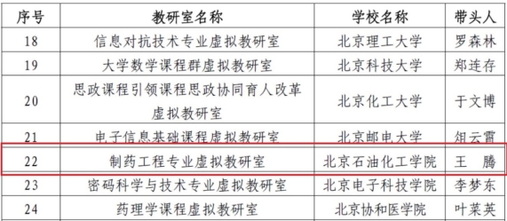 近日,教育部辦公廳發布《關于公布第二批虛擬教研室建設試點名單的通知》(教高廳函〔2022〕13號),我校新材料與化工學院制藥工程專業牽頭的“制藥工程專業虛擬教研室”獲批教育部虛擬教研室建設試點。在此次第二批虛擬教研室建設試點名單中北京市屬高校共五所,我校列位其一。