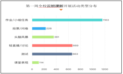 2019-2020學年春季學期第一周全校云班課新開展教學活動3198項,其中作業/小組任務、輕直播/討論、測試類活動數量最多。