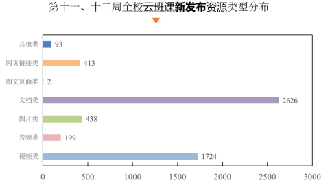 ②2019-2020學年春季學期第11、12周,全校云班課新發布資源5495個,較上周增加2562個,環比增長87%。