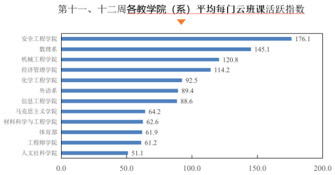 ④第十一、十二周各教學院(系)的課均活躍指數在51.1-176.1之間,全校平均每門云班課活躍指數94。