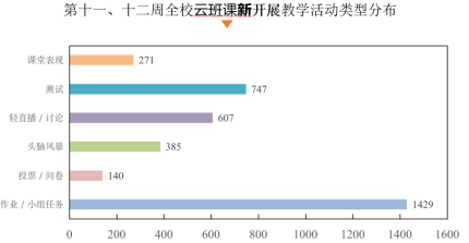 ③2019-2020學年春季學期第十一、十二周,全校云班課新開展教學活動3579項,較上周增加1155項,環比增長47%。