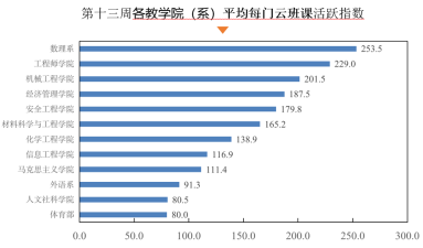 5、第十三周各教學(xué)院(系)的課均活躍指數(shù)在80-253.5之間,全校平均每門云班課活躍指數(shù)153。