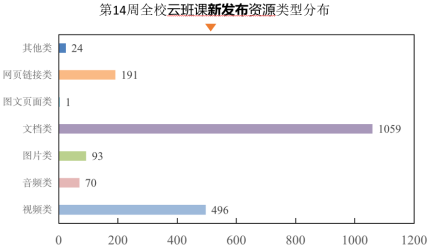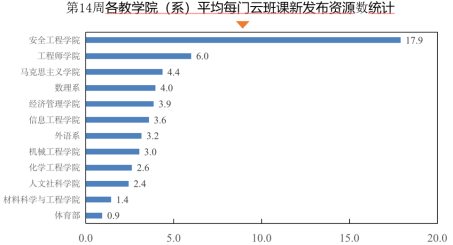3、第14周各教學院(系)的課均新發布資源在0.9-17.9之間。