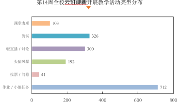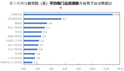 5、第14周各教學院(系)的課均新開展活動在1.3-13之間,全校平均每門云班課新開展活動數3.4。